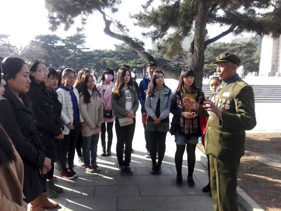 在抗美援朝烈士陵园中,雄伟的英雄纪念碑,在绿树环抱下尤显得庄严而肃穆。董必武先生题写的“抗美援朝烈士英灵永垂不朽”十二个大字,如同将那段记忆刻入历史的骨血一般敲打在我们的内心中,激烈而震撼。在烈士陵园中我们邀请到了中国人民志愿军老战士报告团的马世勋同志,作为亲身经历了那场战争的老战士,为我们回顾了20世纪50年代,在党中央和毛泽东同志的领导下,中国人民进行了抗美援朝的伟大斗争,中华民族的优秀儿女组成中国人民志愿军,与朝鲜人民军一道,取得了这场反侵略战争的伟大胜利的情景。中国人民和中国人民志愿军所表现出的爱国主义、革命英雄主义和紧密团结共同御侮的精神,体现了中华民族精神的精华,充分展示了祖国和人民的利益高于一切的爱国主义精神。