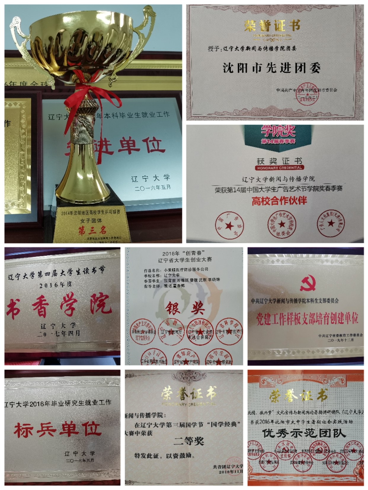 学院重视学生创新能力培养,鼓励学生参加专业大赛,强化“以奖带学”。近四年,学生斩获各类国家级、省市级、校级奖项达107项:双创周吉祥物“壮壮”衍生品设计大赛国家级一等奖、“创青春”辽宁省大学生创业大赛银奖、辽宁省新媒体设计竞赛一等奖、全国大学生广告艺术大赛营销策划类辽宁省一等奖、大学生广告艺术节学院奖—第15届秋季赛佳作奖,“新青年·新生活·新新闻”短视频新闻大赛优秀奖等好成绩。