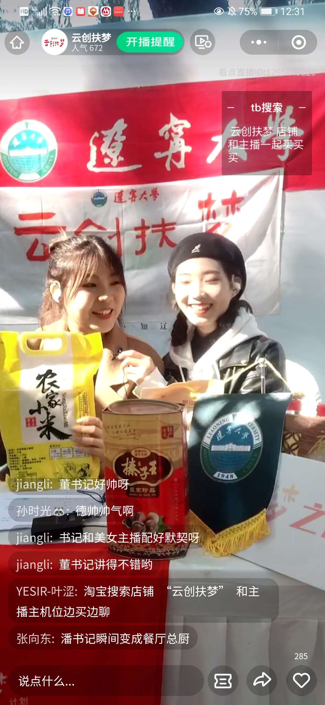 2020年10月16日上午,由辽宁省商务厅、辽宁省国资办主办的“丰饶辽乡”首届电商助农直播活动拉开帷幕。辽宁大学全国“互联网+”创新创业大赛红色青年筑梦之旅省级金奖“云创扶梦”团队项目团队,受邀到友谊宾馆青年湖畔现场,为第一书记们助力直播带货。本项目也是唯一一家以高校本科生为主体,受邀参与直播的单位。