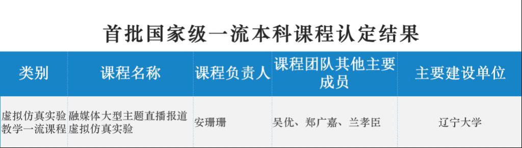 我校共有5门专业主干课程入选首批国家级一流本科课程。其中我院安珊珊老师率领教学团队建设的《融媒体大型主题直播报道虚拟仿真实验》,是我校唯一入选国家级虚拟仿真金课的专业课程。课程建设教师团队成员包括吴优、郑广嘉和兰孝臣。