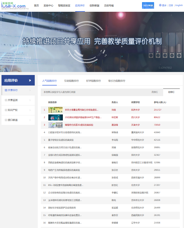 本项目在国家虚拟仿真实验教学共享平台应用评价全国总榜中位列16(共计2079个项目)