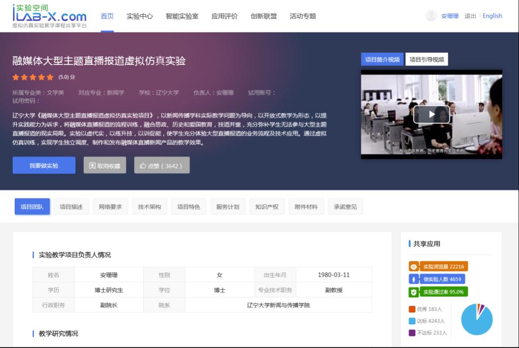 本项目在国家虚拟仿真实验教学共享平台上的应用推广数据为:实验浏览量22216人次,做实验人数4659人次,实验通过率95%,4202人进行了5分评分,获得评论数量4700人次。